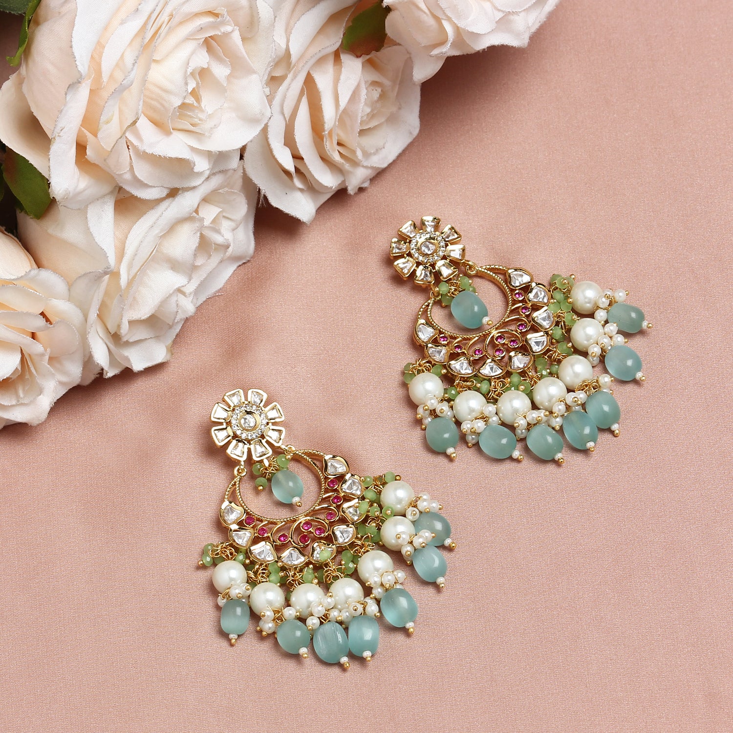 Material Used: Powder Blue Onyx Stones, Vellore Polki, Fresh Water Pearls. The Earring is Gold Plated with Ecoating on top.