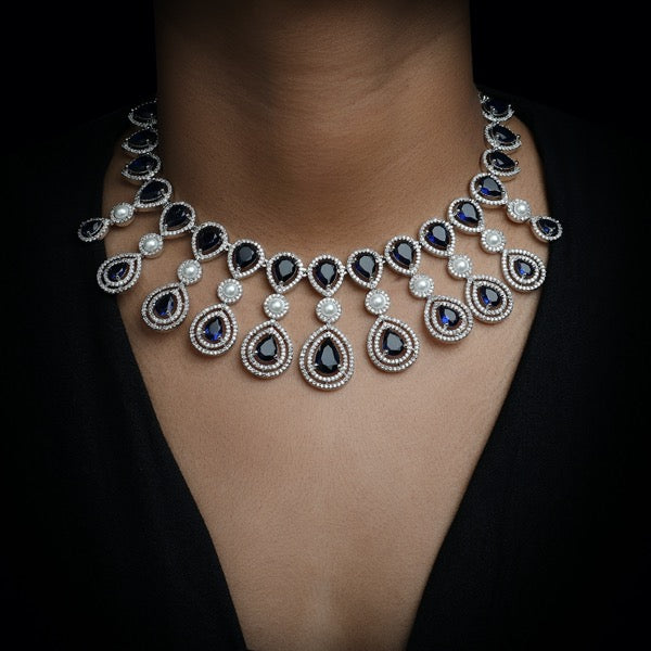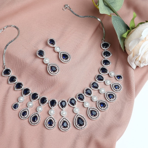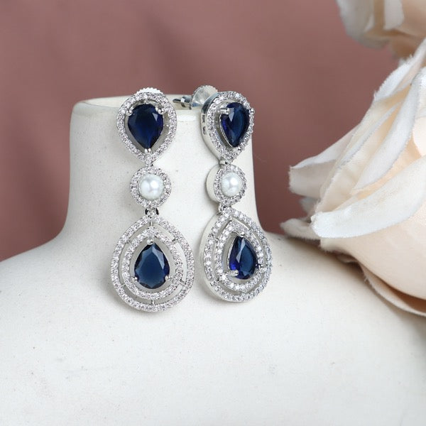 Material Used: American Diamonds with Sapphire Blue Glass Stone and Rhodium Plating.