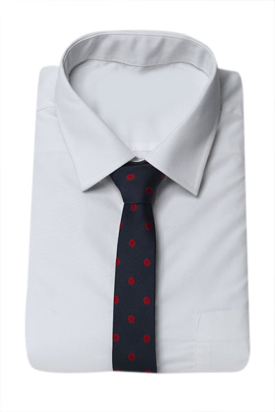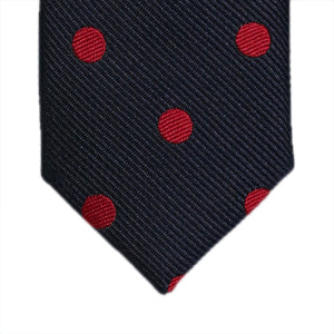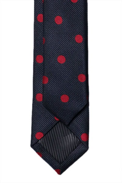 A sharp narrow tie, straight out of Mad Men. Featuring red Polka on a navy blue base, this exquisite tie is a must have to add to your timeless tie collection.