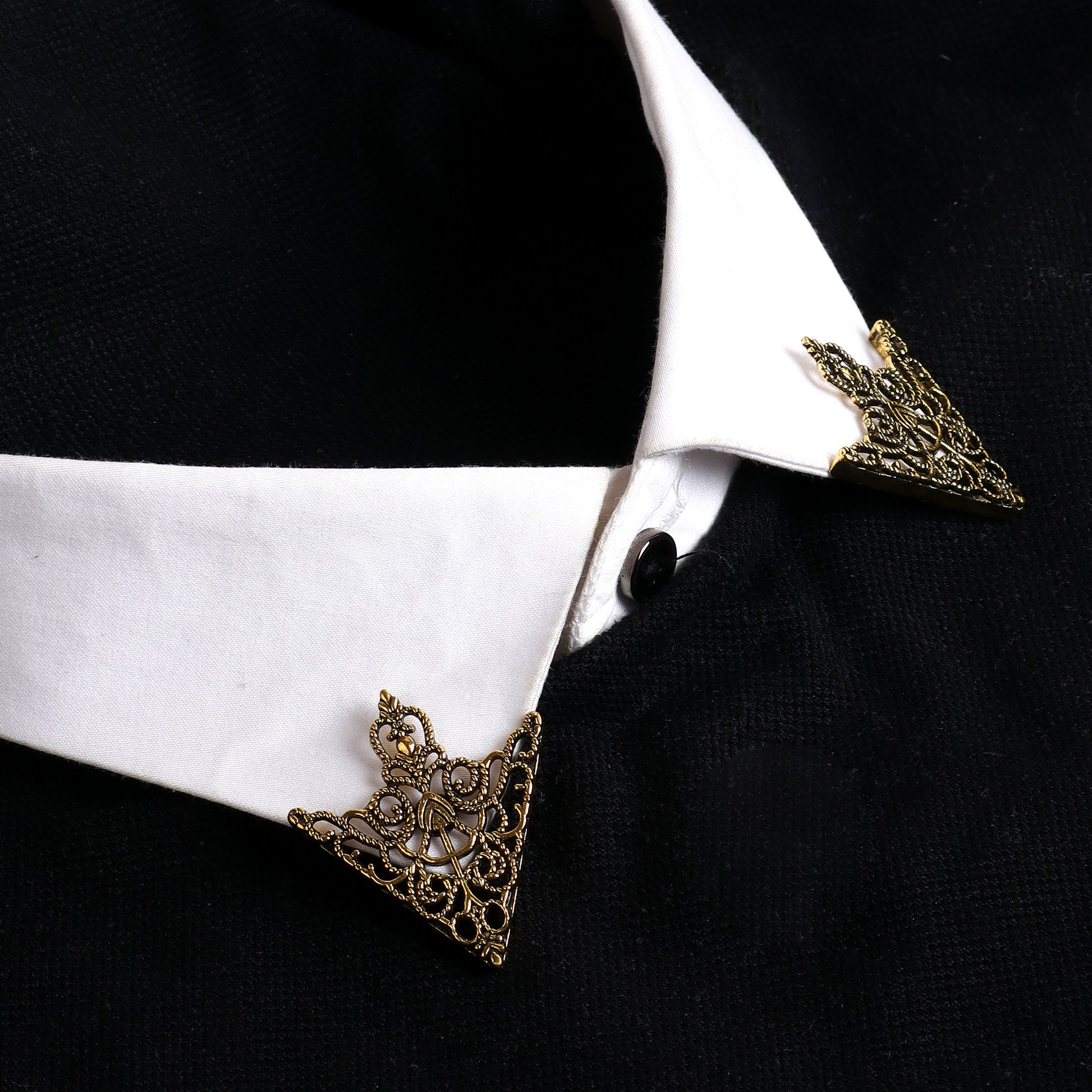 Accentuate your shirt collars with these amazing collar pins. These intricately designed pins have a beautiful pattern, set on a gold base. They look glamorous and give off a majestic and vintage aura. A must have, for your collection.