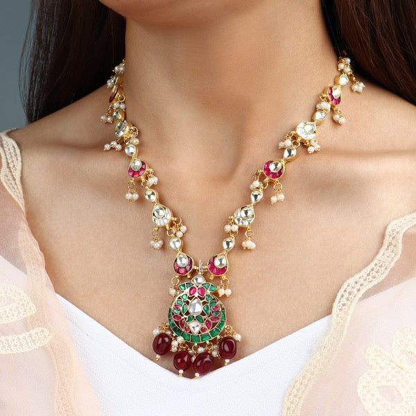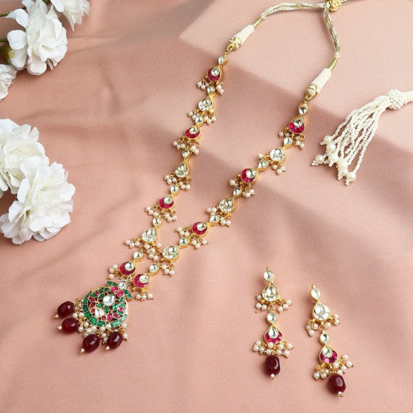 Material Used: Pachi Ahmedabadi Kundan, Fresh Water Pearls, Green and Ruby Onyx. The Set is Gold Plated with Ecoating on top.