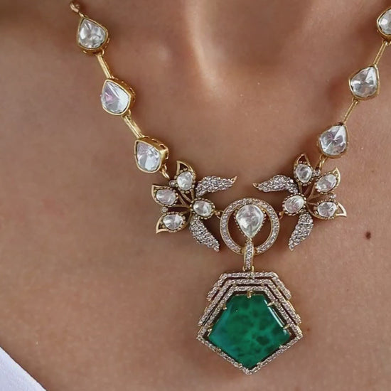 Material Used: Vellore Polki, Doublet, Green Onyx, American Diamonds. The Set is Gold Plated with Ecoating on top.
