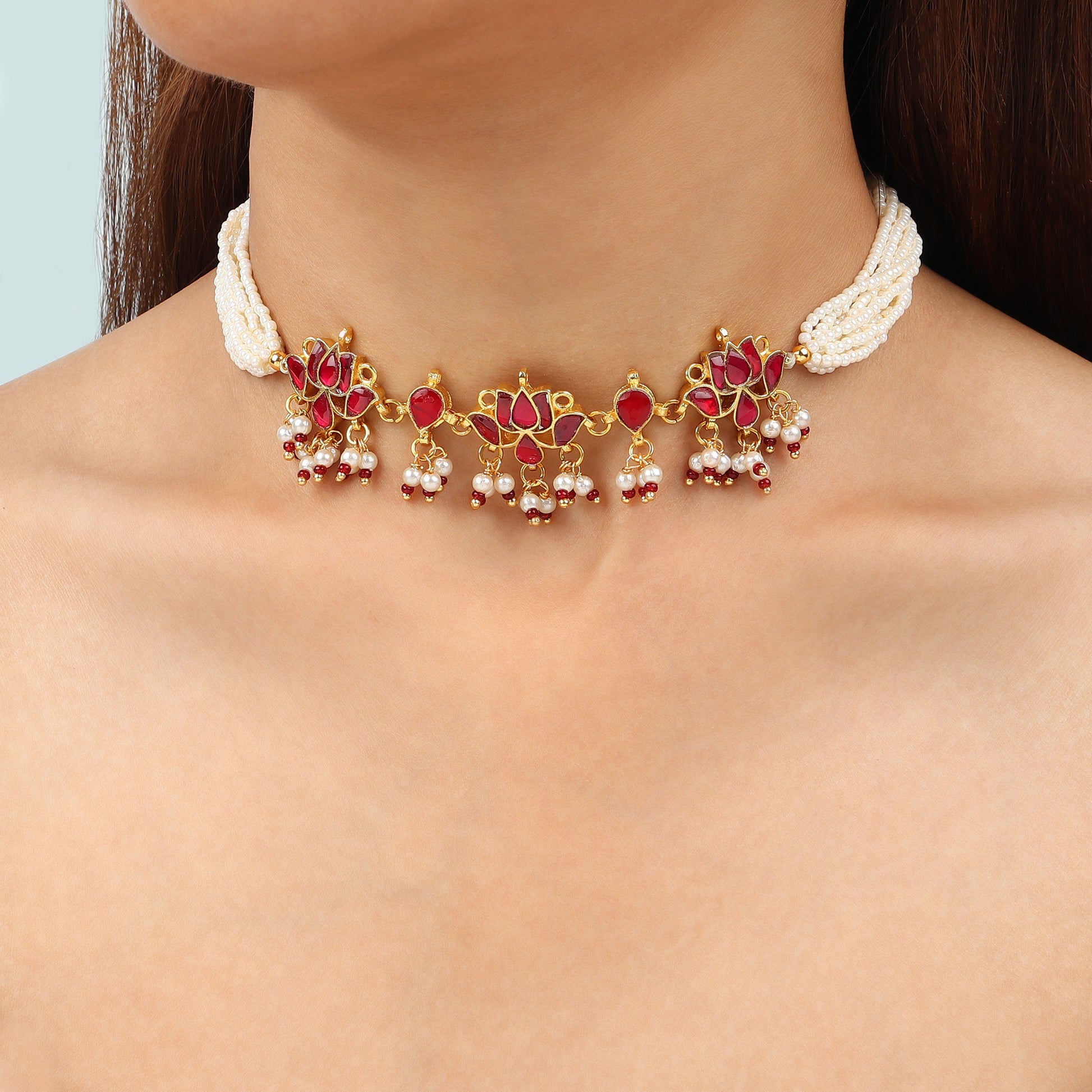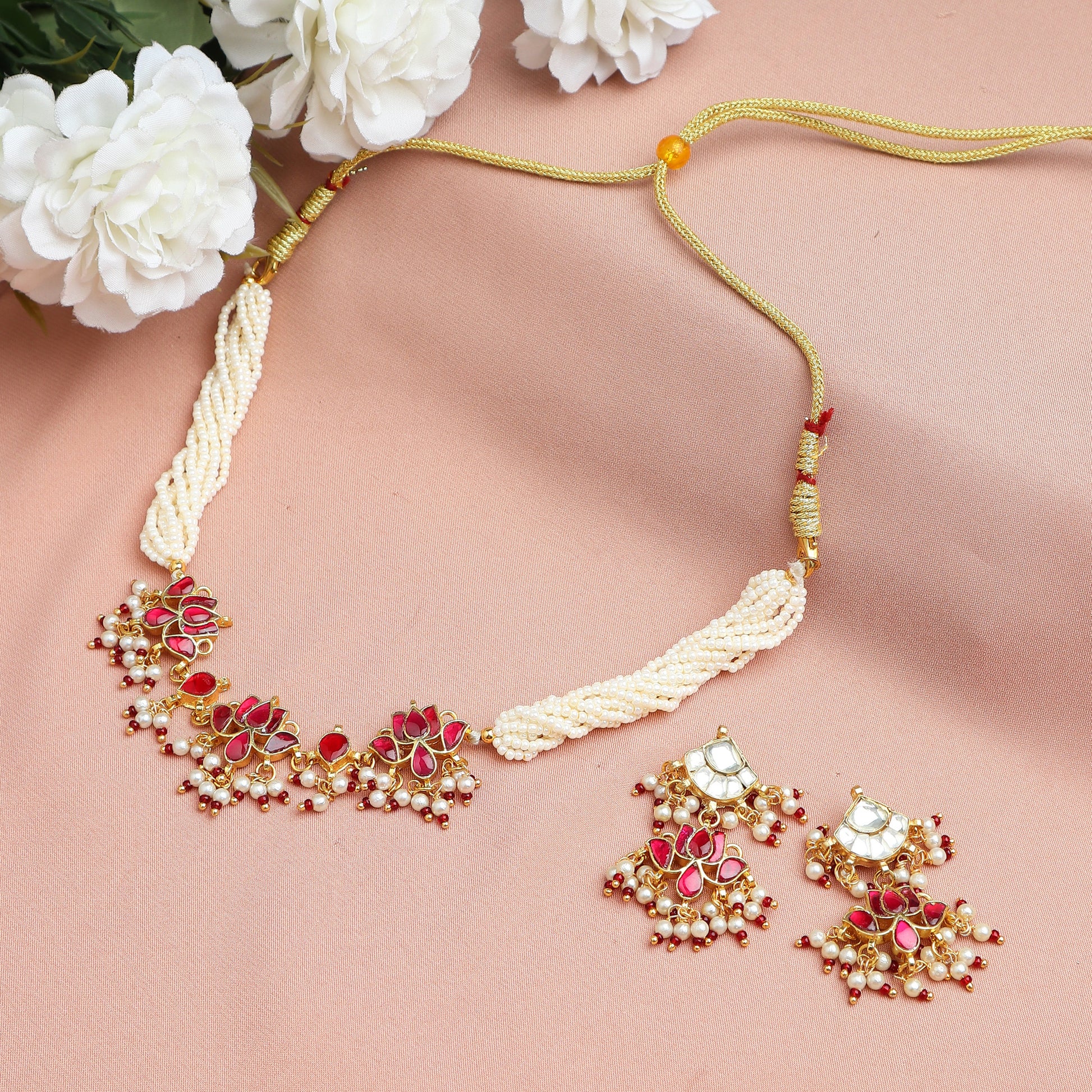 Material Used: Pachi Ahmedabadi Kundan, Fresh Water Pearls, Ruby Onyx. The Set is Gold Plated with Ecoating on top.