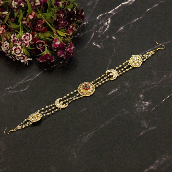 Material Used: Vellore Polki, Fresh Water Pearls, Ruby Onyx. The SheeshPhool is Gold Plated with Ecoating on top.