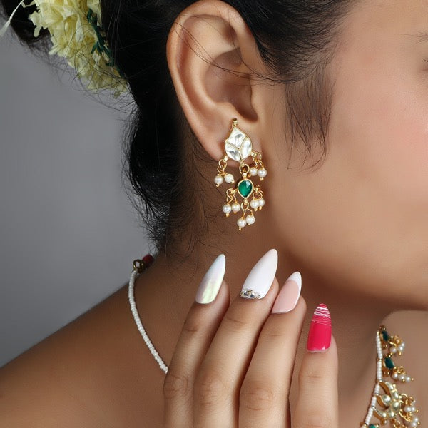 Material Used: Green Onyx Stones, Vellore Polki, Fresh Water Pearls. The Set is Gold Plated with Ecoating on top.