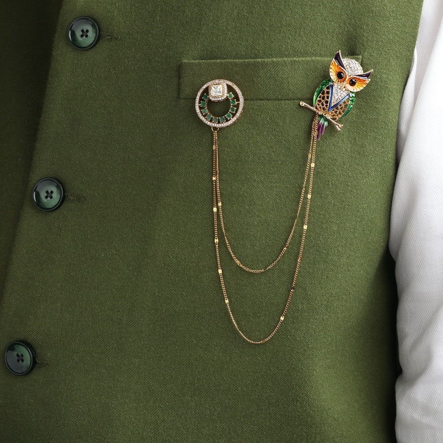 Material: Brass, MultiColour Owl with RhineStones, Emerald Onyx Stud with Polki, Gold Plated Chain