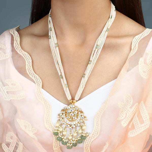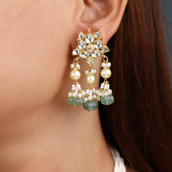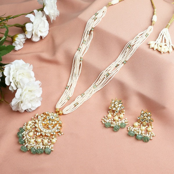 Material Used: Pachi Ahmedabadi Kundan, Fresh Water Pearls, Green Onyx. The Set is Gold Plated with Ecoating on top.