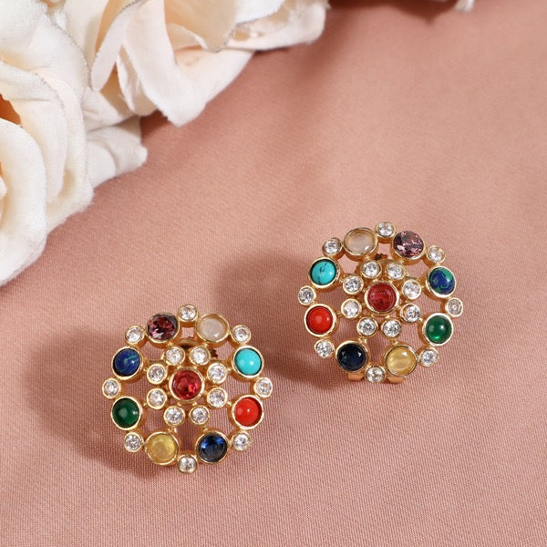 Material Used: Navratan Onyx Stones, Vellore Polki. The Earring is Gold Plated with Ecoating on top.