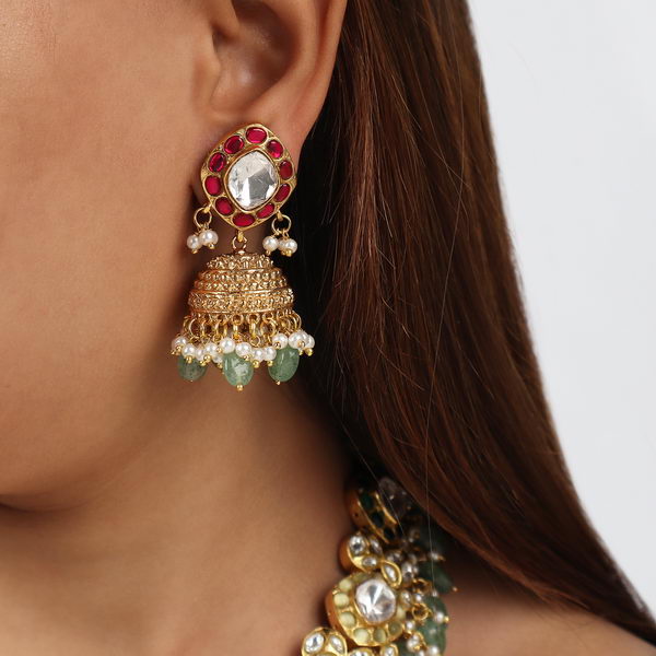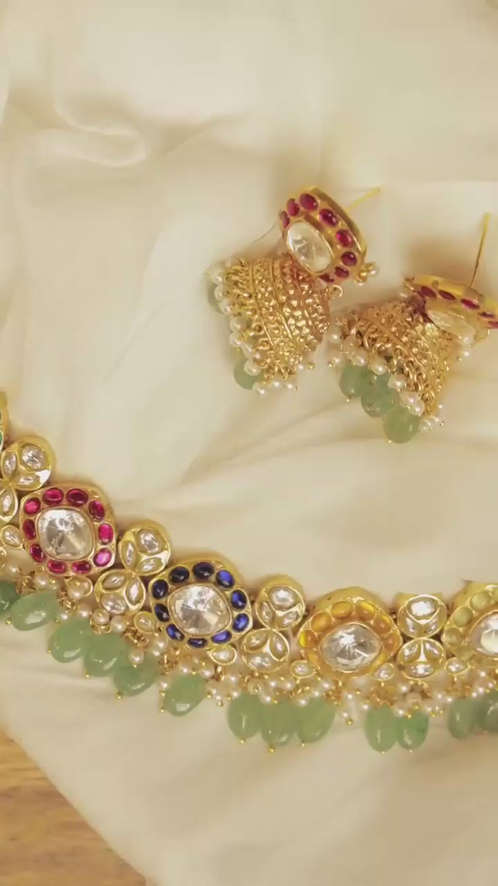 Material Used: Silver Foil Polki, Green Onyx, MultiColour Stones. The Set is Gold Plated with Ecoating on top.
