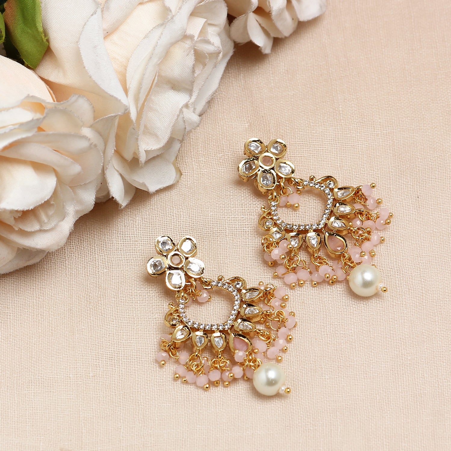 Material Used: Pink Onyx Stones, Vellore Polki, Fresh Water Pearls. The Earring is Gold Plated with Ecoating on top.