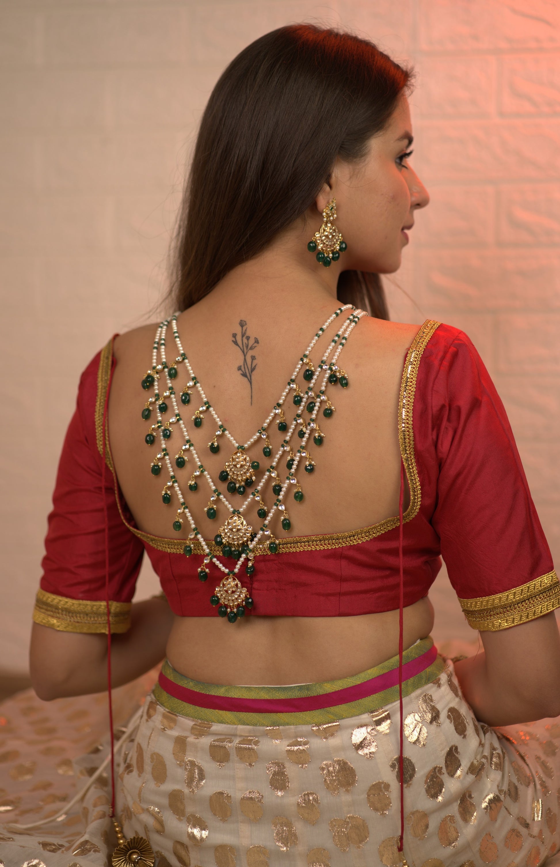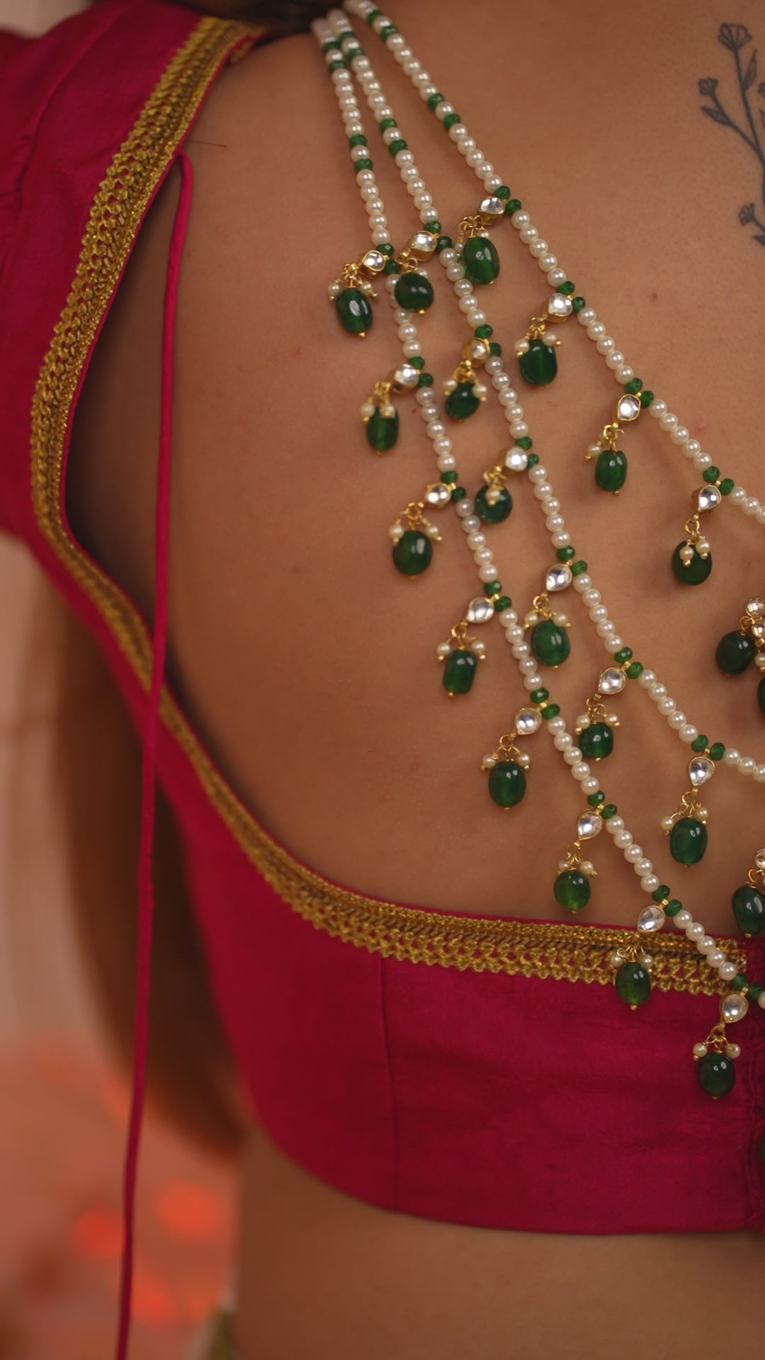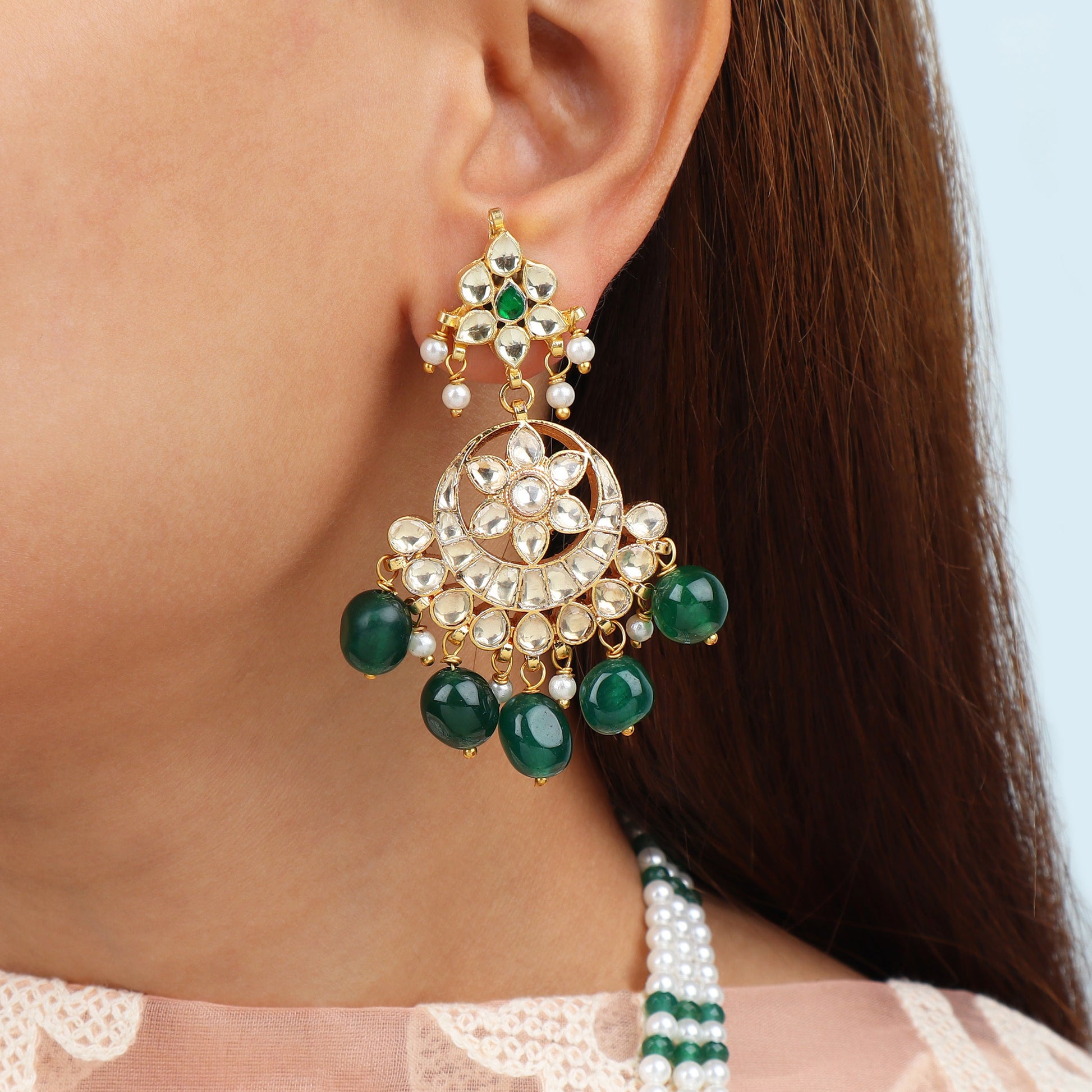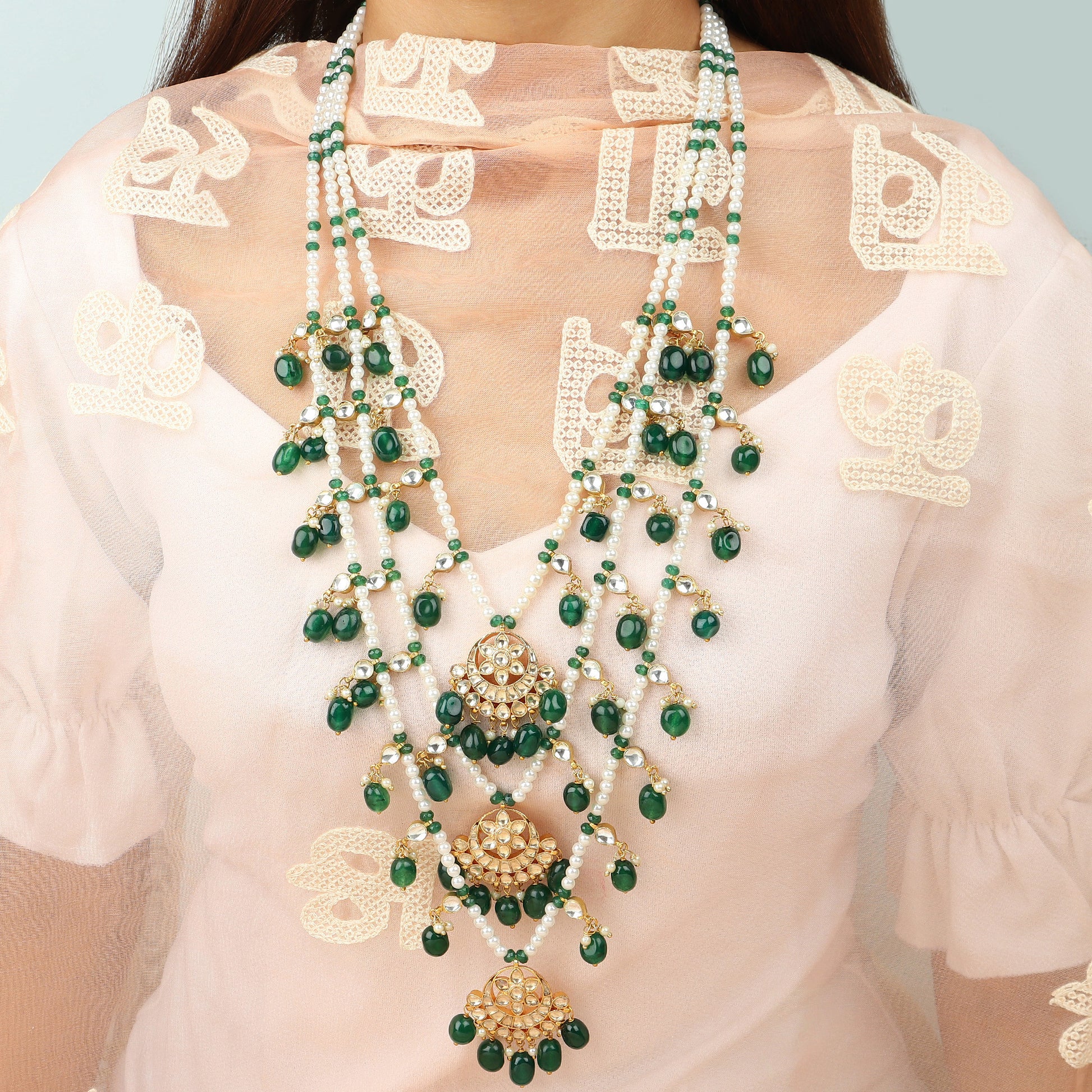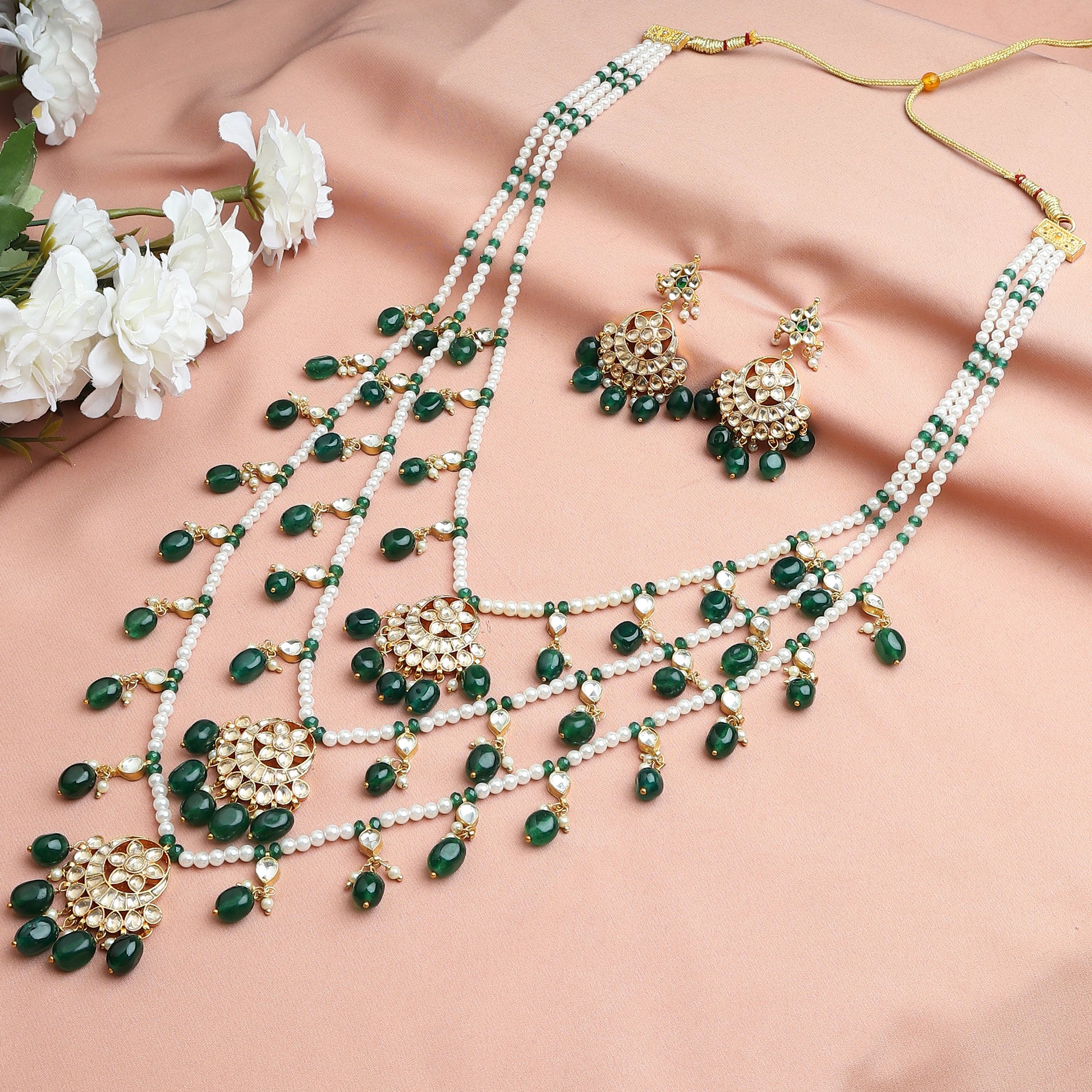 Material Used: Pachi Ahmedabadi Kundan, Fresh Water Pearls, Green Onyx. The Set is Gold Plated with Ecoating on top.