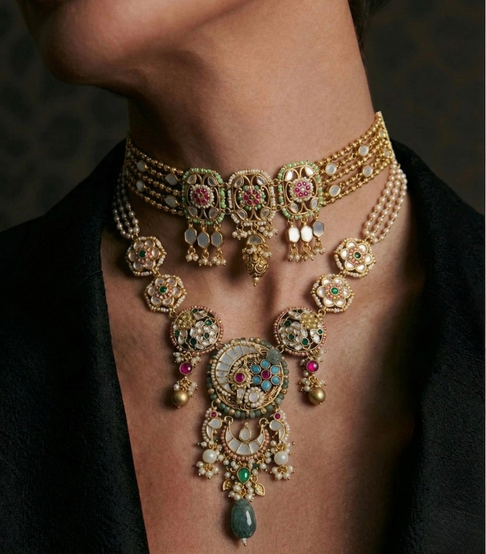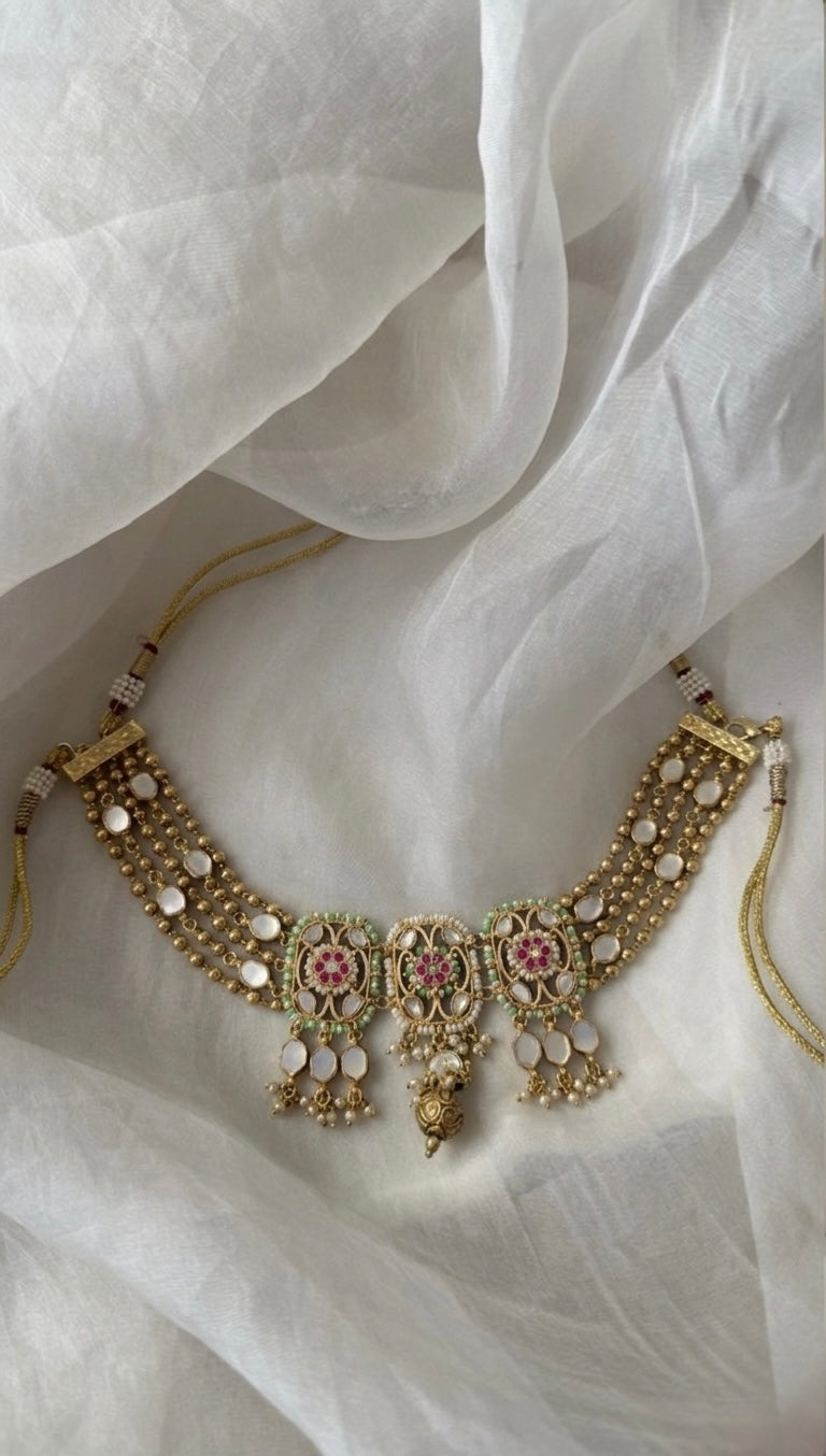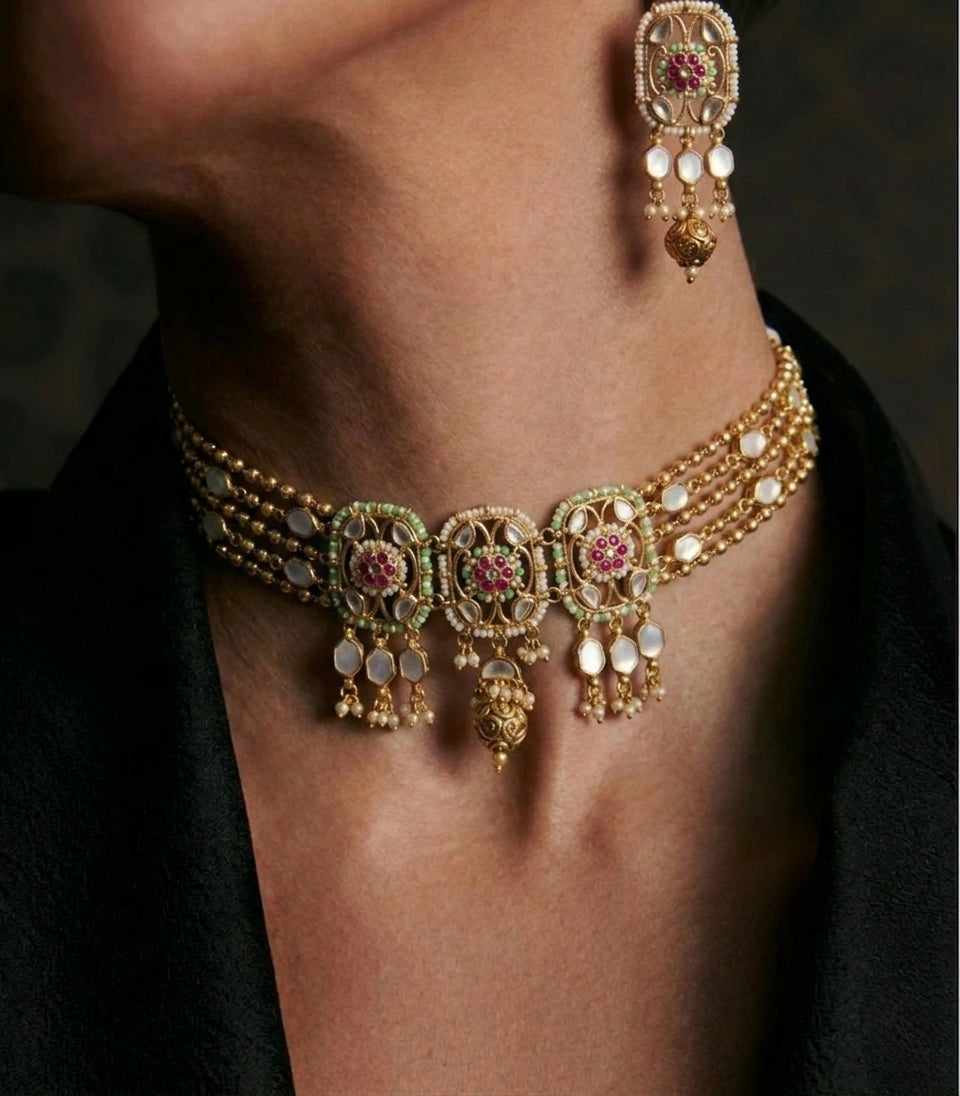 A radiant choker adorned with delicate pearls, kundan accents, and intricate floral motifs—designed to bring a soft, timeless glow to every look.