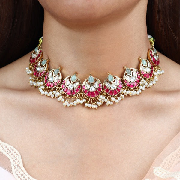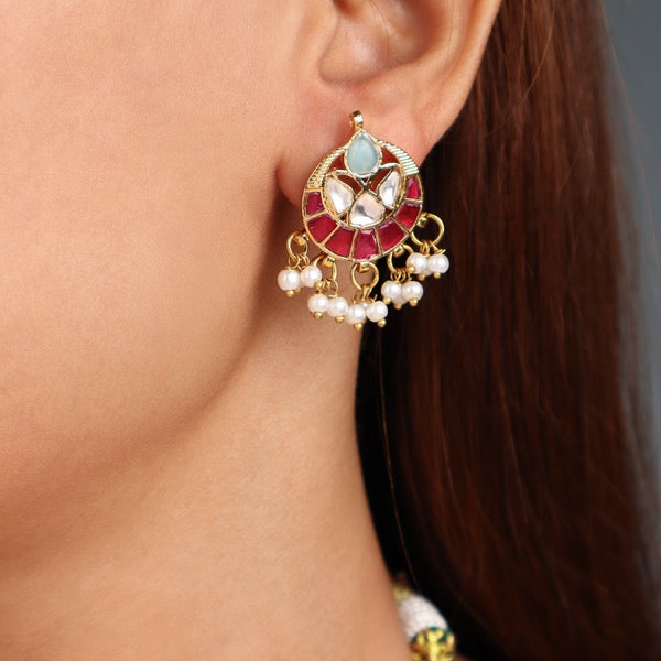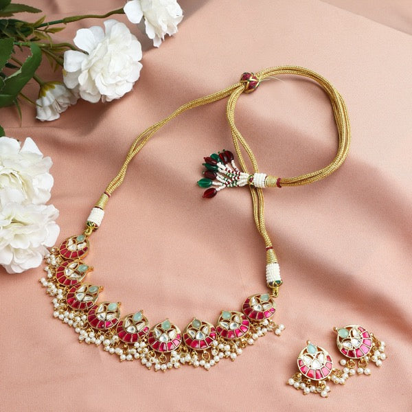 Material Used: Pachi Ahmedabadi Kundan, Fresh Water Pearls, Green and Ruby Onyx. The Set is Gold Plated with Ecoating on top.