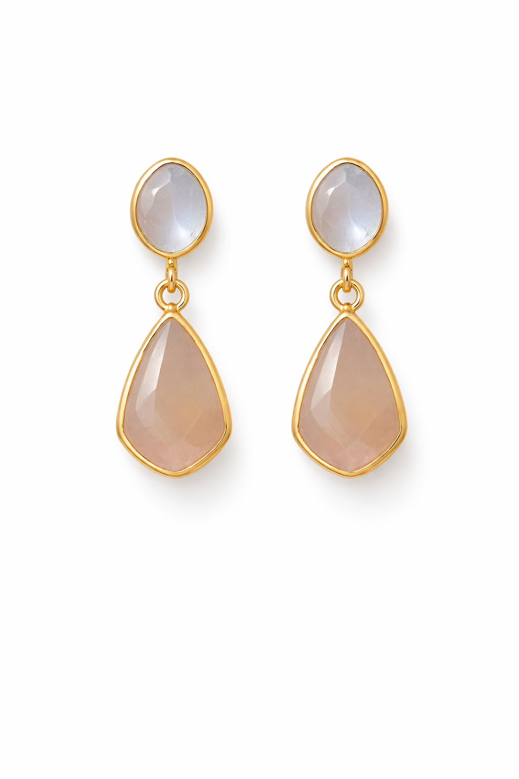 Delicate and luminous, these earrings feature Rainbow moonstone and Peach moonstone set in warm gold, creating a soft glow with every movement.