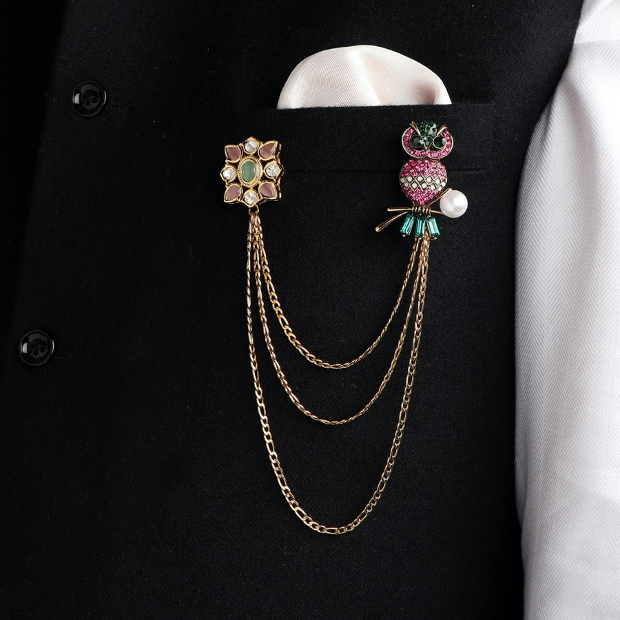 Material: Brass, MultiColour Owl with RhineStones, Multi Onyx Stud with Polki, Gold Plated Chain