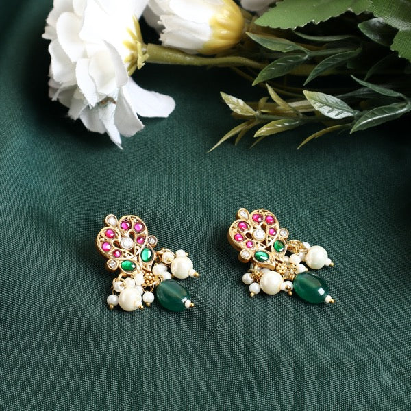 Material Used: Vellore Polki, Emerald and Ruby Onyx Stones, Fresh Water Pearls. The Earring is Gold Plated with Ecoating on top.