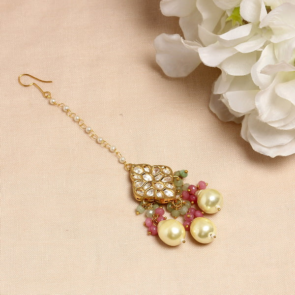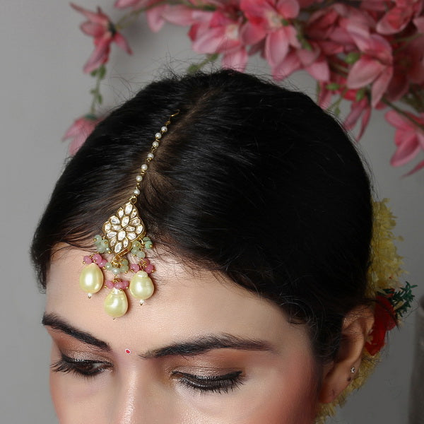 Material Used: Green and Pink Onyx Stones, Vellore Polki, Fresh Water Pearls. The Maang Tikka is Gold Plated with Ecoating on top.