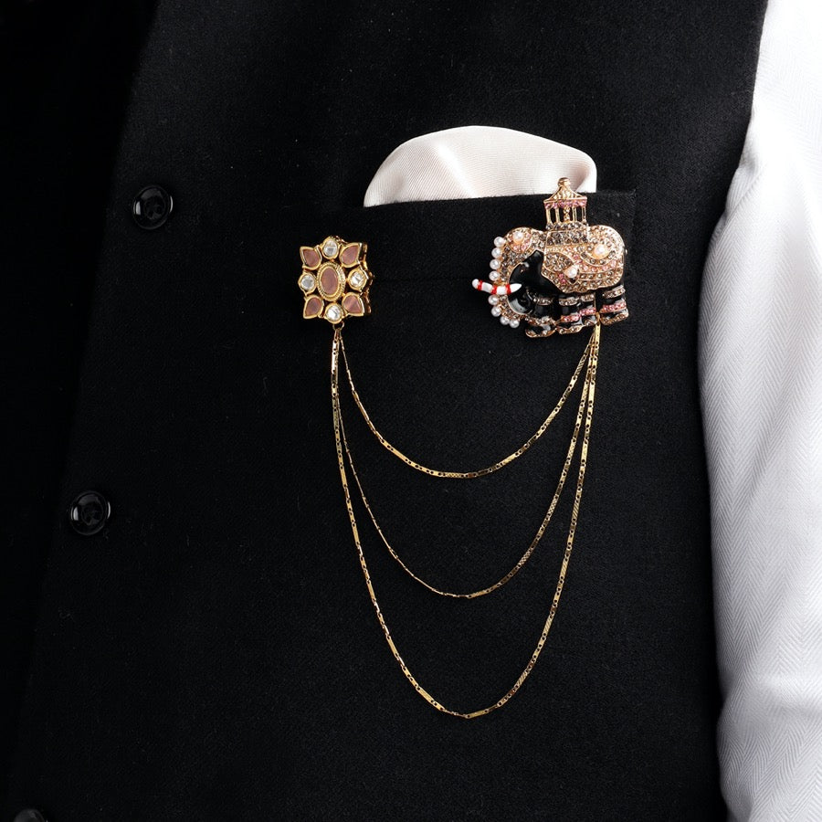 Material: Brass, MultiColour Elephant, Pink Onyx Stud with Polki, Gold Plated Chain