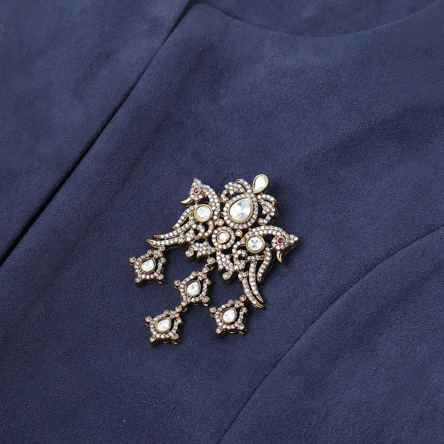 Material: Brass, Anitque Colour Polki Brooch, Polki Stud, Gold Plated Chain