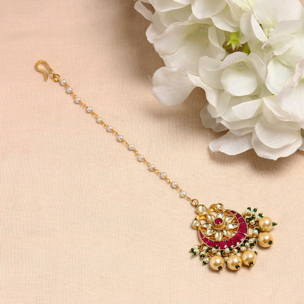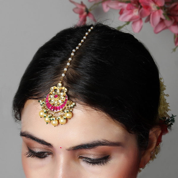 Material Used: Pachi Ahmedabadi Kundan, Vellore Polki, Fresh Water Pearls. The Maang Tikka is Gold Plated with Ecoating on top.