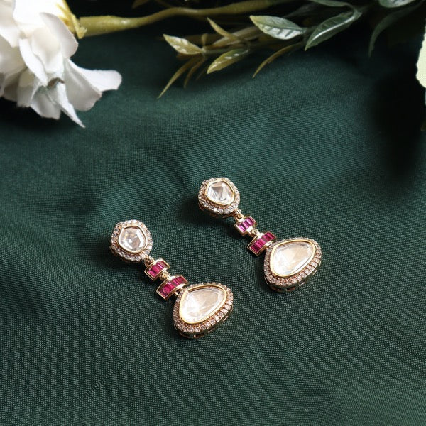 Material Used: Vellore Polki, Ruby Glass Stone. The Earring is Gold Plated with Ecoating on top.