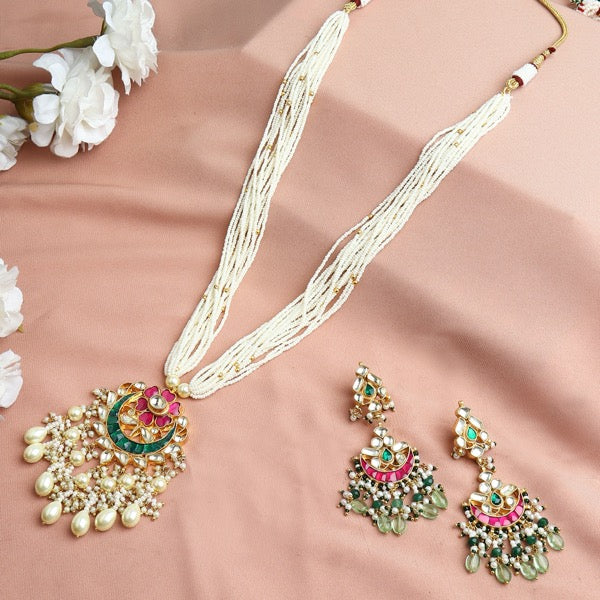 Material Used: Pachi Ahmedabadi Kundan, Fresh Water Pearls, Green and Ruby Onyx. The Set is Gold Plated with Ecoating on top.