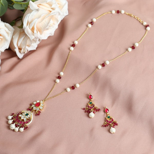 Material Used: Pachi Ahmedabadi Kundan, Ruby Onyx Stones, Green Onyx Stones, Fresh Water Pearls. The Set is Gold Plated with Ecoating on top.