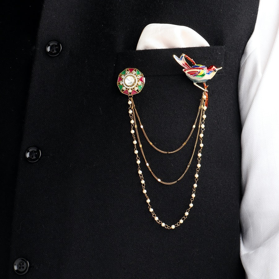 Material: Brass, MultiColour Sparrow, Navratan Onyx Stud with Polki, Gold Plated Chain with Pearls