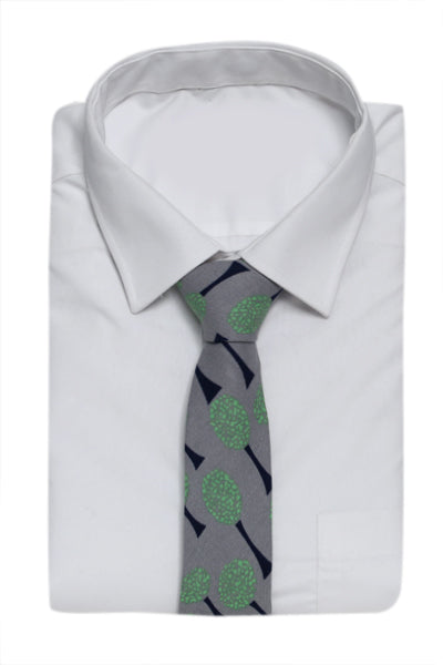 A tie to compliment your sophistication and match your glamorous style. This piece is set in a bright grey base with richly colored tree pattern and a sense of grandeur.
