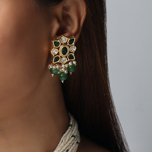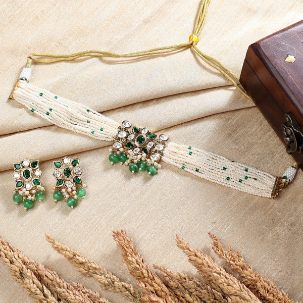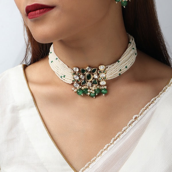 Material Used: Faux Polki, Fresh Water Pearls, Green Onyx. The Set is Gold Plated with Ecoating on top.