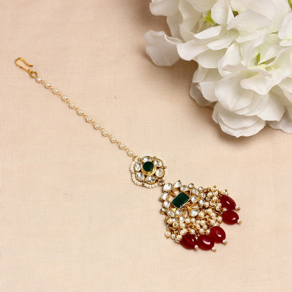 Material Used: Green and Ruby Onyx Stones, Vellore Polki, Fresh Water Pearls. The Maang Tikka is Gold Plated with Ecoating on top.