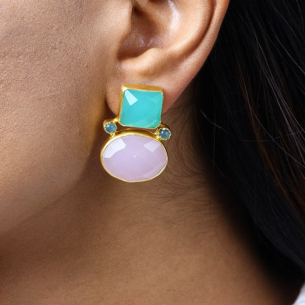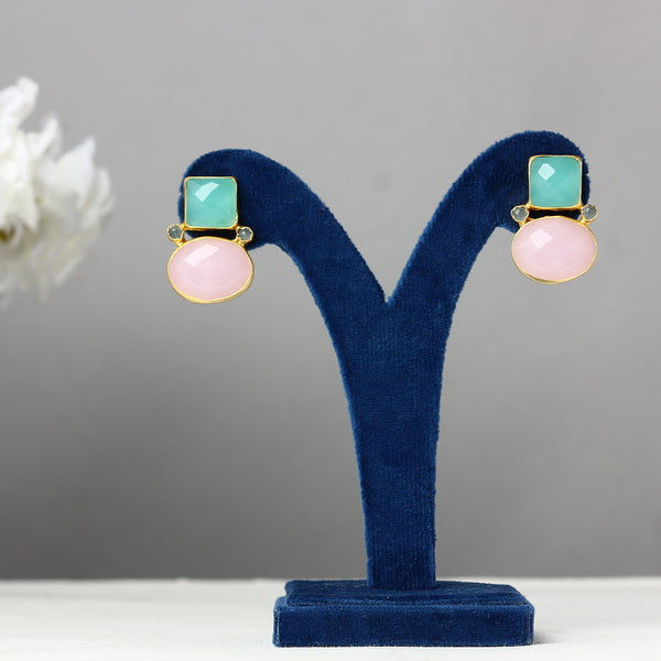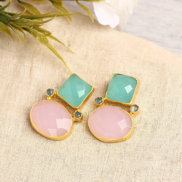 Base Material: Silver Alloy (Nickel and Lead Free) Coating: Gold Plated Stone: Pink and Green Chalcedony